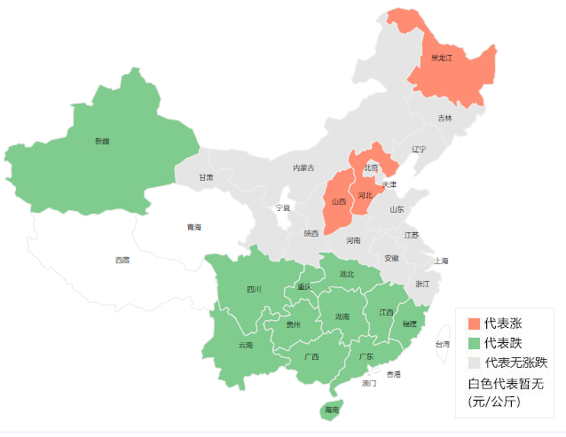 2021-6-2 华东 上海 9.0~9.4 110kg 平 山东 8.3~9.0 110kg 平 安徽 8.1~8.8 110kg 平 浙江 9.0~9.4 110kg 平 江苏 8.5~9.0 110kg 平 福建 8.5~9.5 110kg 跌 华中 江西 8.5~8.8 110kg 跌 湖北 8.1~8.9 110kg 跌 河南 8.3~8.8 110kg 平 湖南 8.4~9.1 110kg 跌 华南 广东 8.6~9.2 110kg 跌 广西 8.5~9.1 110kg 跌 海南 11.0~11.7 110kg 跌 华北 北京 8.3~8.5 110kg 平 天津 8.3~8.5 110kg 平 山西 8.4~8.8 110kg 涨 河北 8.4~8.8 110kg 涨 东北 黑龙江 7.8~8.3 110kg 涨 吉林 7.9~8.3 110kg 平 辽宁 7.9~8.5 110kg 平 西北 陕西 8.1~8.8 110kg 平 甘肃 7.9~8.2 110kg 平 西南 重庆 8.1~8.4 110kg 跌 四川 8.0~8.4 110kg 跌 云南 8.0~8.3 110kg 跌 贵州 8.1~8.3 110kg 跌